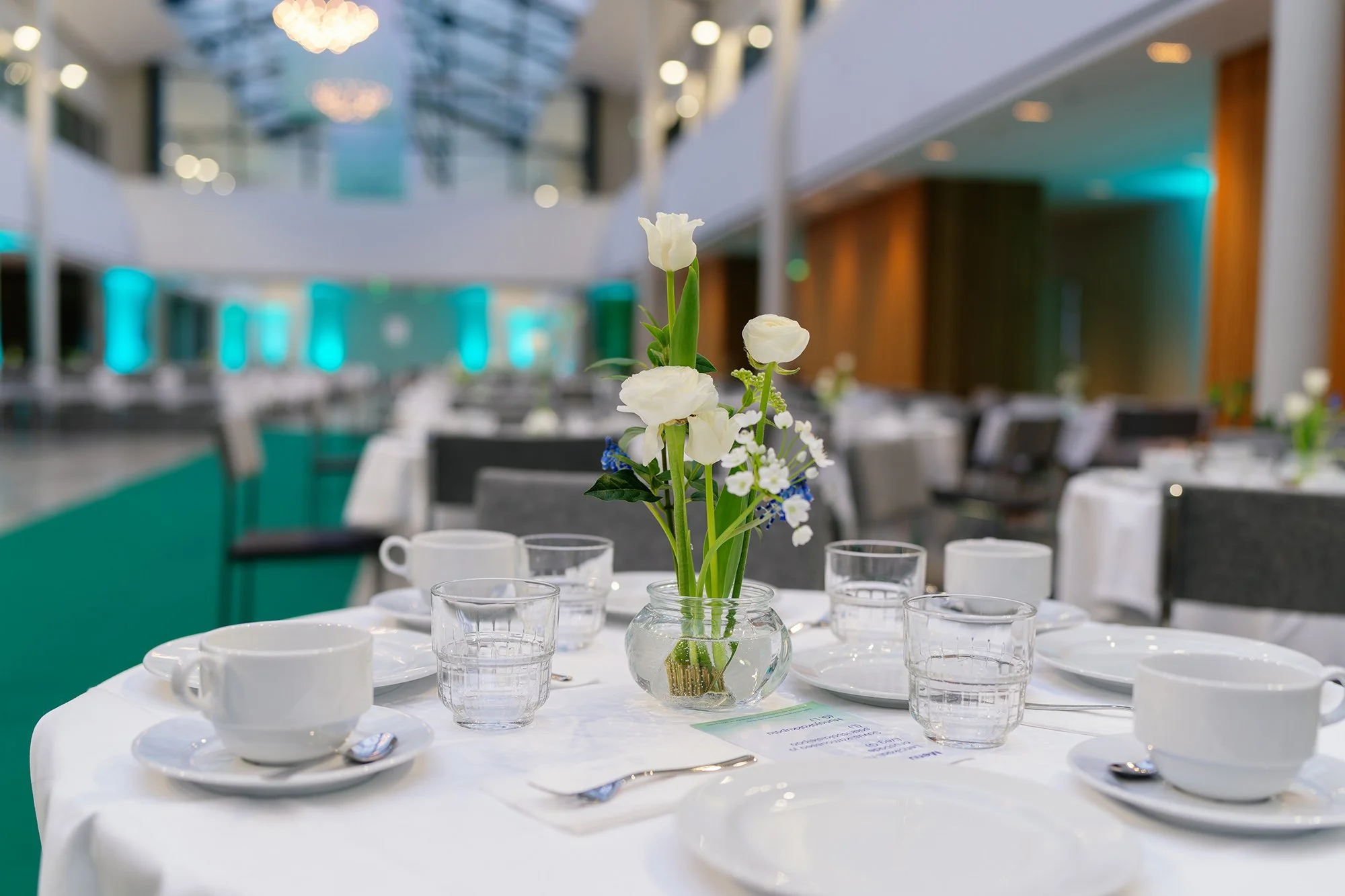 Lisäksi sali koristeltiin teemaan sopivilla pienillä kukkakimpuilla.